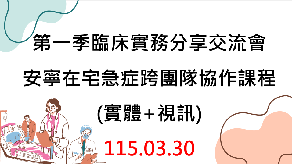 【實體+視訊場】第一季臨床實務分享交流會-安寧在宅急症跨團隊協作課程 【實體+視訊場】第一季臨床實務分享交流會-安寧在宅急症跨團隊協作課程 時間:
