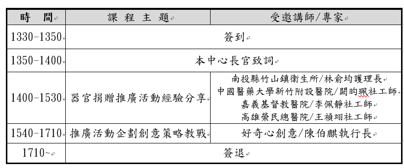 一、 目的:為提倡我國器官捐贈的正確觀念與風氣,政府需仰賴各層級的醫療衛生單位來共同推廣,推廣方式及技巧時常考驗臨床實務工作者的規劃與創意能力,爰此,本次課程著重於器官捐贈實務推廣之實務經驗分享及推廣活動企劃創意策略教戰,期盼讓臨床實務工作者可互相交流學習,同時增進自我能力。